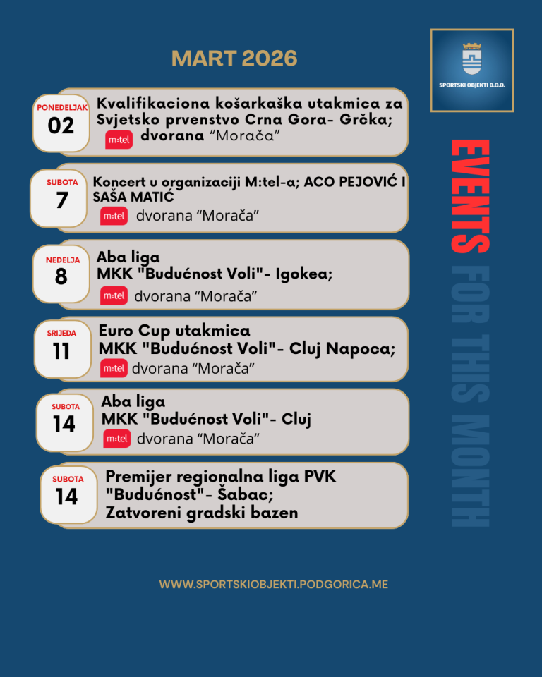 MJESEČNI KALENDAR DOGAĐAJA 27/02/2026 Sportski objekti – Mart 2026. Dragi građani,predstavljamo vam mjesečni kalendar aktivnosti za mart 2026. Raspored pratite na našem profilu – Opširnije...
